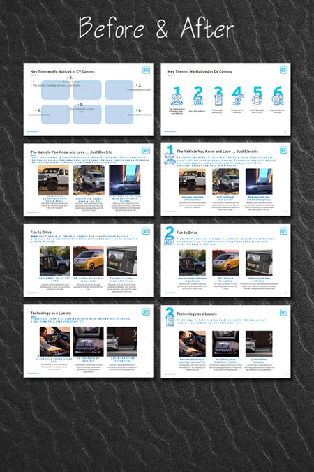 In the Before and After section of my portfolio, you'll find a diverse range of examples showcasing my design transformation skills. From hand-drawn slides that evolved into polished presentations for client review, to slides crafted from scratch and tailored to specific templates, each example highlights my attention to detail and creativity. Additionally, I have instances where I successfully transferred content between templates and enhanced existing slides for clarity and visual appeal. This section illustrates my commitment to delivering high-quality design solutions that meet the unique needs of each client.