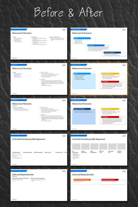 In the Before and After section of my portfolio, you'll find a diverse range of examples showcasing my design transformation skills. From hand-drawn slides that evolved into polished presentations for client review, to slides crafted from scratch and tailored to specific templates, each example highlights my attention to detail and creativity. Additionally, I have instances where I successfully transferred content between templates and enhanced existing slides for clarity and visual appeal. This section illustrates my commitment to delivering high-quality design solutions that meet the unique needs of each client.